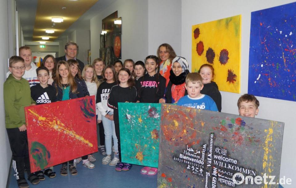 Voller Stolz wurden die getrockneten Leinwände später an Schulleiter Werner Winderl übergeben und sie zieren nun den Zugang zu Rektorat und Lehrerzimmer. In der Mitte der vier Leinwände befindet sich das „Herz“ des Projekts: eine Action-Painting-Leinwand in dazu passenden Farben und Techniken mit dem Wort „Willkommen“ in allen Sprachen. Sichtbares Zeichen dafür, dass sich jeder an der Doktor-Eisenbarth-Schule willkommen und wohl fühlen soll, unabhängig von Geschlecht, Alter, Nation, Sprache oder Kultur.