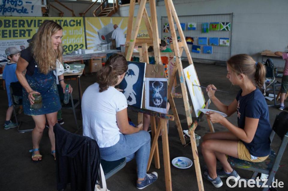 "Vielleicht malst du in den blauen Himmel noch einige Wolken und Vögel": Immer wieder gab Katrin Gierlach den Kindern im Bauhof Tipps und Empfehlungen, wie sie ihre Bilder noch schöner und kreativer gestalten könnten. Etwa 100 Kinder hatten sich angemeldet, um an dem dreitägigen Malkurs der Freunde der Kunst mit der Künstlerin teilzunehmen. "Endlich können wir nach zwei Jahren Stillstand wieder starten und die Malkurse durchführen", freute sich Gabi Ried, die zusammen mit weiteren Vorstandsmitgliedern Farben an die Kinder verteilt, sie mit Getränken versorgt und am Schluss alles wieder aufräumt hat.