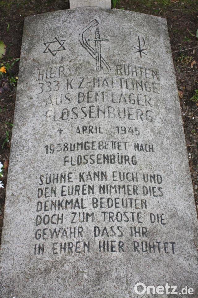Die Grabstätte erhielt damals eine Einfassung und einen Gedenkstein 70 mal 110 Zentimeter mit der Inschrift: "Hier ruhen 20 K.Z.-Häftlinge aus dem Lager Flossenbürg + April 1945. Friede den Verfolgten, Friede der Welt!" Der Gedenkstein wurde seinerzeit vom Landratsamt Oberviechtach bei den Granitwerken Karl Egerer in Floss in Auftrag gegeben. Am 26. August 1957 wurden die Gebeine exhumiert und kurzfristig in den Sammelfriedhof in Wetterfeld bei Roding übergeführt.