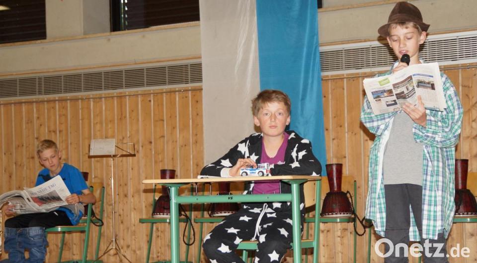 Die Schüler der fünften Klasse, die erst seit gut einem halben Jahr das Spielen auf Blasinstrumenten lernen, meisterten ihren ersten Auftritt mit Bravour. Begleitet von „Pilotin“ Astrid Senft und „Co-Pilotin“ Alexandra Albang aus dem „Raumschiff 5b“ kündigte Rektor Winderl, der als Moderator durchs Programm führte, das Lied vom „Astronaut“ an, das als Rap aufgebaut war. Für Erheiterung sorgte der Sketch „Das Telefongespräch“ von Toni Lauerer, den drei Schüler der Klasse 6b unter der Leitung von Katrin Humbs vorführten. Das Interesse für den Kauf eines Gebrauchtwagens wurde für einen Mann zur Geduldsprobe, da er telefonisch nur ein Kind erreichte.