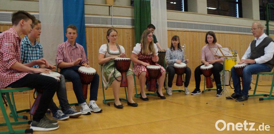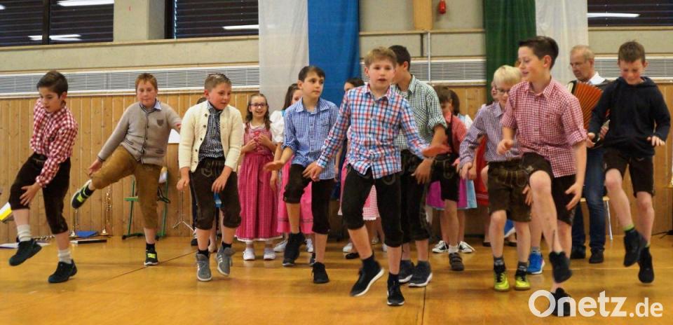 Für Aufsehen sorgte die Tanzdarbietung der Klasse 5a mit Konrektor Rudi Schneider am Akkordeon. In Dirndl und Lederhose präsentierten die Buben und Mädchen den Song „Rock mi“, der mit viel Applaus gewürdigt wurde. Der Lehrerchor entführte die Gäste nach Afrika mit den beiden Liedern „Banaha“ und „We are marching“ („Siyahamba“). In der Pause konnten sich die Gäste mit Getränken erfrischen, die von den Neuntklässlern verkauft wurden.