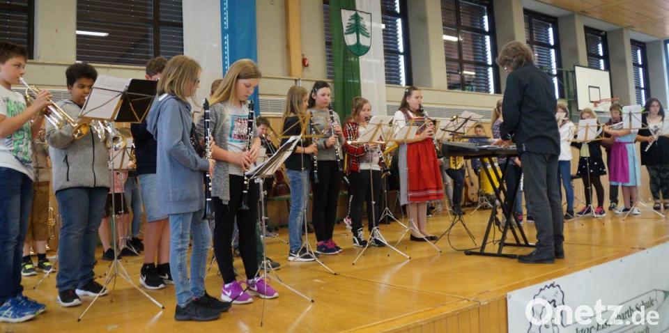 Mit der Schulfanfare, die Musiklehrer Jürgen Rohr komponiert hat, und dem Stück „Horch was kommt von draußen rein“ eröffnete die Bläsergruppe unter der Leitung von Christian Knott das Konzert, das unter dem Motto „Musik vereint uns“ stand. Rektor Werner Winderl freute sich bei seiner Begrüßung über die vielen Gäste, unter ihnen auch Dekan Alfons Kaufmann und Elternbeiratsvorsitzende Petra Meier. Unter der Stabführung von Jürgen Rohr und Alois Schneeberger hatten die Bläserklassen 5 und 6 ihren großen Auftritt mit vier bekannten Stücken. Es erklangen die als Europa-Hymne bekannte „Ode an die Freude“, „Aura Lee“, das schwungvolle „Good Night, Ladies“ und „Narcotic“ mit dem markanten Keyboard-Intro. Für ihr Repertoire erhielt das Bläser-Ensemble viel Beifall.