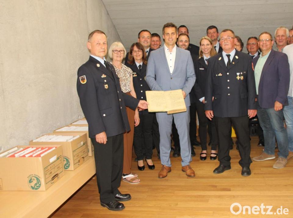 Bürgermeister Rudolf Teplitzky stellte den großen Wert dieser Chronik heraus, da diese Feuerwehrgeschichte mit ihrer Dokumentation von Bränden, Überschwemmungen und Katastrophen, aber auch vielen positiven Ereignissen, gleichzeitig auch Stadtgeschichte sei, die nun im Archiv auch der Nachwelt erhalten bleibe. Archivarin Christa Zapf nahm mit sichtlicher Freude diese gut 10 000 Seiten umfassende Chronik in Empfang und bewertete die Chronik als „ein großes Stück Kulturgut".
