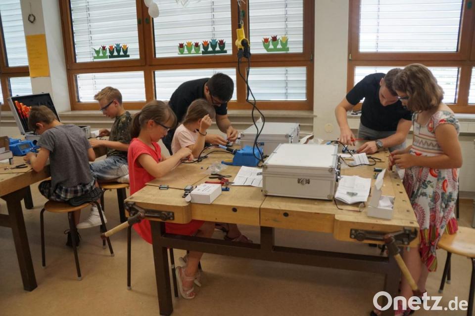 Die Lehrlinge Tobias Balk, Benjamin Müller und Andreas Sorgenfrei hatten als Tutoren alle Hände voll zu tun. Unter ihrer Anleitung wurden verschiedene elektronische Bausätze von den Schülern gelötet. Eine selbstgebaute LED-Taschenlampe, ein Wechselblinker und eine Kojak-Sirene durften die Kinder am Ende des Kurses mit nach Hause nehmen.