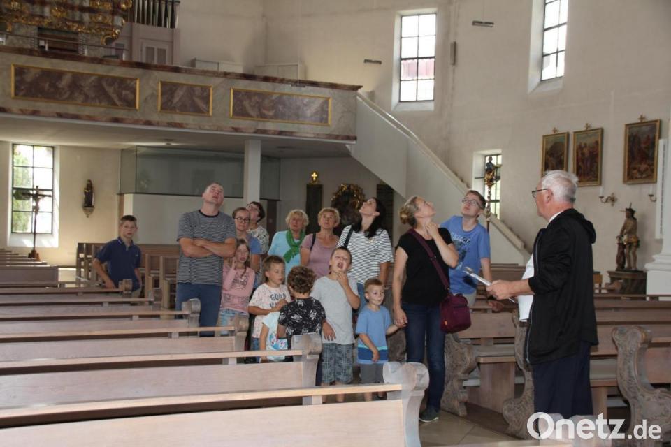 Antworten auf viele Fragen, was die Stadtpfarrkirche anbetrifft, konnten Kirchenpfleger Günther Flierl und sein Enkel Wolfgang beantworten: Zahlreich waren Kinder und Erwachsene zum Ferienprogramm in die Pfarrkirche St. Johannes gekommen.