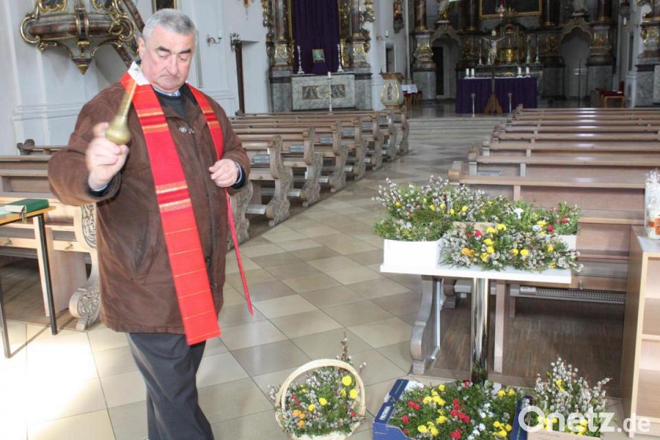 Der Palmsonntag eröffnet die feierliche Liturgie der Karwoche. Aber in Zeiten der Corona-Pandemie werden diese traditionellen religiösen Zeremonien in einer eingeschränkten Form vollzogen. Die Weihe der Palmbüschel, die in normalen Zeiten mit einer feierlichen Prozession und anschließendem Festgottesdienst in der Stadtpfarrkirche verbunden ist, vollzog Stadtpfarrer Alfons Kaufmann bereits im Vorfeld ganz alleine. Die Gottesdienste am Palmsonntag werden ohne Besucher durch den Pfarrer und Kaplan Florian Frohnhöfer zelebriert.