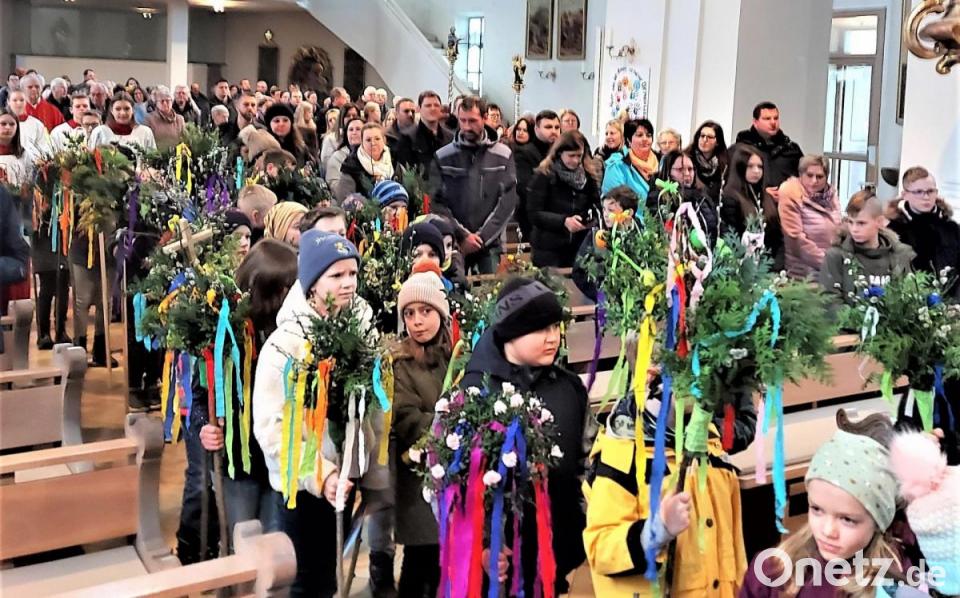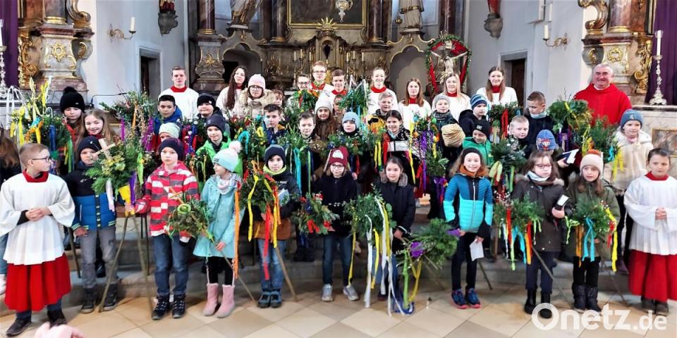 Mit mächtigen Palmbüscheln auf 80 Zentimeter langen Stöcken zogen die Kommunionkinder am Palmsonntag nach der Segnung durch Dekan Alfons Kaufmann durch die Stadtpfarrkirche. Vor dem Festgottesdienst wurden die imposanten Gebinde mit den farbenfrohen Bändern vor dem Altarraum und an den Seitenaltären platziert. Bei der Fertigung der Palmbüschel hatten die Eltern der Kommunionkinder mitgewirkt. Die Lesung der Kinder mit verteilten Rollen und die Predigt von Stadtpfarrer Kaufmann richteten den Blick auf den Kontrast zwischen dem feierlichen Einzug Jesu in Jerusalem und der anschließenden Passion mit der Kreuzigung auf Golgotha.