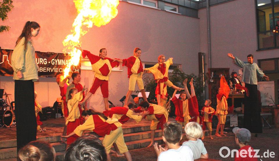 (lg) Ein buntes Programm erlebten heuer die Gäste des Sommerfestes am Ortenburg-Gymnasium. Für Schüler, deren Eltern, Lehrer, Ehemalige und Freunde des Gymnasiums war es ein kurzweiliger und unterhaltsamer Begegnungsabend, nicht zuletzt, weil die Schülermitverantwortung (SMV) als Veranstalter in ihrem Programmangebot auch auswärtige Gruppen einbezogen hatte. So trat im Innenhof der Schule, wo sich der Hauptteil des Abends abspielte, auch die Tanzgruppe Grün-Weiß auf, in der Schülerinnen des OGO zum "Stammpersonal" zählen. Ein volles Programm mit Feuerspuckern, Stelzengängern und Akrobatik lieferten auch die Gaukler des Ortenburg-Gymnasiums ab, die unter den Klängen des Kolping-Spielmannszugs eine beeindruckende Performance boten. Florian Waldherr vom Doktor-Eisenbarth-Festspielverein hatte sein "Phantastikum" aufgebaut, wo die interessierten Besucher in die "Schwarze Kunst" der Barockzeit entführt wurden.