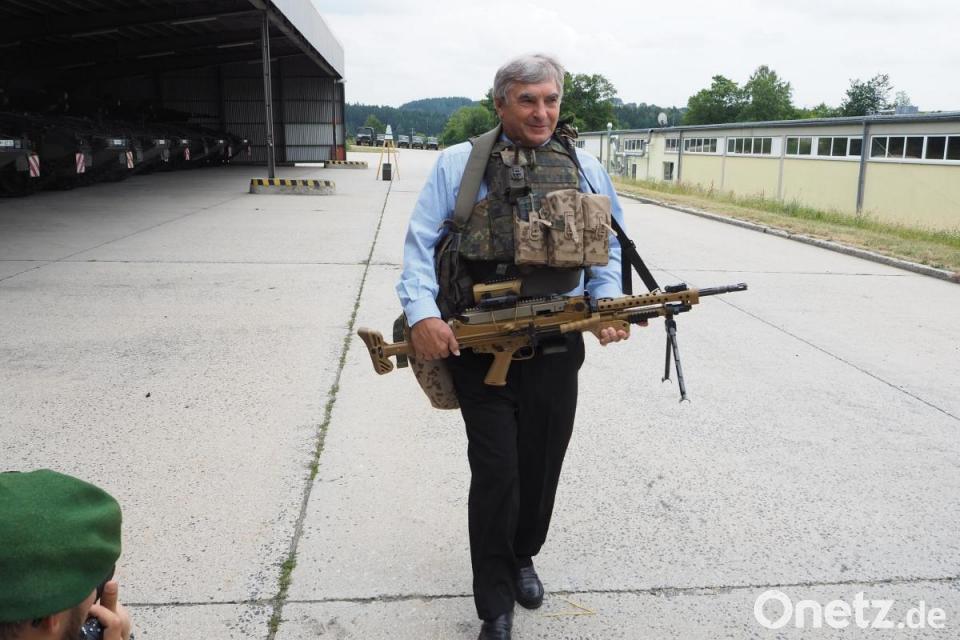 Welches Gewicht so ein Kämpfer mit sich herumschleppt, konnte der Abgeordnete dann am eigenen Leib erfahren. Inklusive Maschinengewehr wog die Ausrüstung 30 Kilometer, mit der er im Laufschritt ein paar Schritte riskierte, während der stellvertretende Kommandeur zu Vorsicht mahnte: Holmeier sei jetzt schließlich Erfahrungsträger mit einer Botschaft für Berlin. Der Bundespolitiker versprach, den schweren Rucksack an Infos bei den Haushaltsberatungen auszupacken - "zur vollumfänglichen Einsteuerung von Prozessen", wie Zweers betonte. Nicht zuletzt ist auch das pächterlose Soldatenfreizeitheim Emil-Kemmer-Haus nicht vergessen: Holheimer kündigte dazu Gespräche an mit der Vorsitzenden der Katholische Arbeitsgemeinschaft für Soldatenbetreuung (KAS), Gisela Manderla.