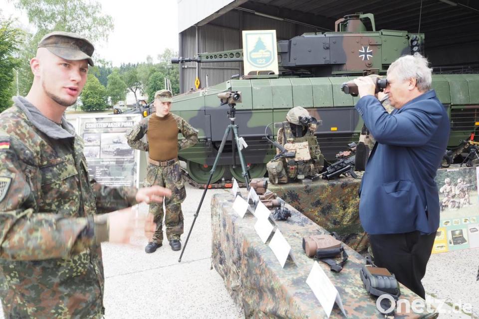 Holmeier hatte bereits rund drei Stunden mit dem stellvertretenden Kommandeur Oberstleutnant Michael Zweers und seinem Stab konferiert, bevor es zum "Großgerät" auf dem Gelände der Grenzlandkaserne ging. In Reih und Glied warteten rund ein Dutzend Modelle des Schützenpanzers Puma. Aber das war noch lange nicht alles. Die Oberviechtacher Soldaten nutzten die Gelegenheit, um optische Geräte, Maschinengewehre und Munition zu präsentieren und hatten auch jede Menge Details parat. "Wir verfügen über eine Top-Ausrüstung der absoluten Spitzenklasse", bestätigte Oberstleutnant Zweers. "Das kann sich weltweit sehen lassen." Weil im Umgang mit den hochkomplexen Geräten aber alles passen muss, sind trotzdem noch Wünsche offen. Der stellvertretende Kommandeur machte deutlich, dass der Panzer aus Sicherheitsgründen ohne eine spezielle Vorrichtung nicht näher als 35 Meter an zivile Personen herankommen darf, und auch dass es manchmal nur um eine simple Schutzplane für die parkenden Fahrzeuge geht, erfuhr der Gast aus Berlin.