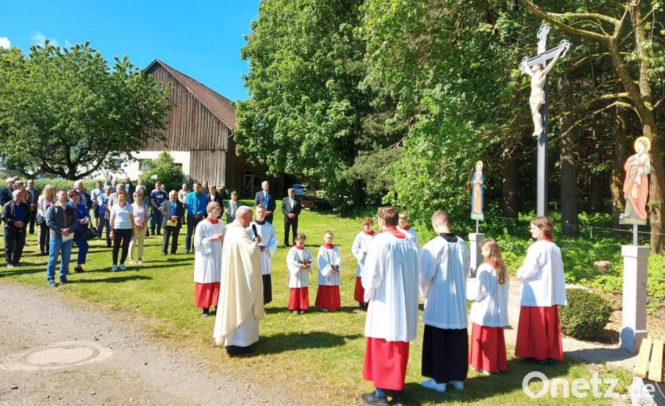 Die diesjährige Pfingstmontagsfeier am Johannisberg war aber auch mit einer besonderen Segnung verbunden. Nach der Eucharistiefeier verlagerte sich das Geschehen zur Kreuzigungsgruppe am Waldrand, wo sich die Gläubigen an der von Grund auf restaurierten Gebetsstätte versammelten. „Spenden der Kolpingfamilie, des Katholischen Frauenbunds und der Pfarrei hatten die längst fällige Restaurierung ermöglicht“, ließ Maria Hanauer in ihren Dankesworten wissen. Die Figuren von Maria und Johannes, die den ebenfalls restaurierten gusseisernen Christus am Kreuz flankieren, wurden völlig neu aus Edelstahl gestaltet. Der Kirchenmaler Andreas Wrba aus Gutmanning übernahm den künstlerischen Part. Hans Baumer besorgte mit seinem Team den Abbau und Aufbau der Figurengruppe. Neu gestaltete Bänke ermöglichen ein Verweilen an dieser religiösen Stätte.