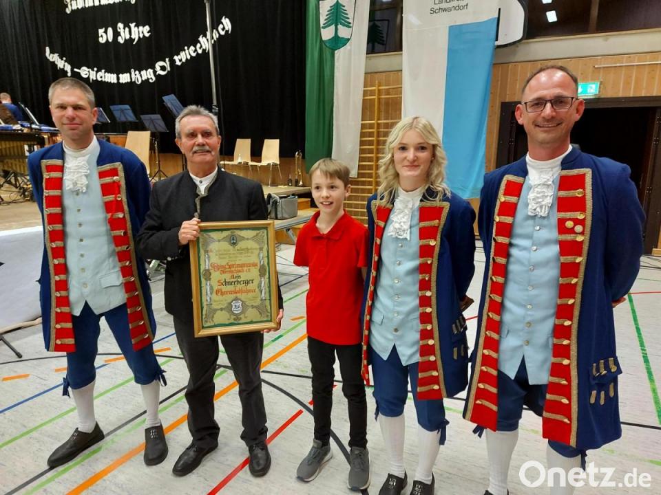 Dramaturgie war auch beim Rückblick auf die 50-jährige Geschichte des Spielmannszugs angesagt, die Thomas Gitter zusammen mit seinen Kindern Julia und Jonah im kurzweiligen Dialog auf die Bühne brachte. In diesem Zusammenhang wurden besonders die Verdienste von Alois Schneeberger als Stabführer, Vorstand und Ausbilder gewürdigt. Schneeberger, der auch im Nordbayerischen Musikbund Führungsfunktionen innehatte, wurde zum Ehrenstabführer des Spielmannszugs ernannt.