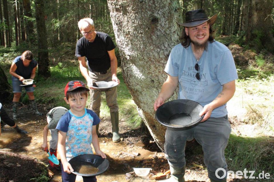 Waschpfanne, Sieb, Schaufel und seit kurzem auch Lupen werden an die Teilnehmer ausgegeben, wobei es die zahlreich vertretenen Buben und Mädchen kaum erwarten können, selbst im Bachbett aktiv zu werden. Zuvor zeigt aber Karlheinz Pieper, wie man mit dem aus dem Forellenbach geschaufelten rötlichen Kies und Sand verfährt. Für die Kinder ist das Ganze eine abenteuerliche Angelegenheit, aber selbst viele erwachsene Teilnehmer sind mit Eifer bei der Sache und hoffen auf das berühmte Nugget, das in der Waschpfanne auftauchen könnte.