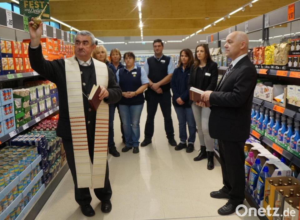 Im Beisein von Filialleiter Markus Tretter, seiner Stellvertreterin Birgit Reitinger, von Melanie Ruff (Verkaufsleitung) und weiteren Mitarbeiterinnen segneten Dekan Alfons Kaufmann und Pfarrer Norbert Schlinke die neue Lidl-Filiale am Schießanger 14, die 500 Quadratmeter Verkaufsfläche mehr umfasst.