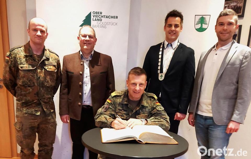 „Oberviechtach ist für mich wie ein Heimkommen“, gestand Brigadegeneral Christoph Huber, als er sich am Freitag ins Goldene Buch der Stad Oberviechtach eintrug. Dieser Termin bildete den Abschluss seines „ersten Dienstaufsichtsbesuchs“ beim Panzergrenadierbataillon 122, das seit 1. Februar offiziell zur Panzerbrigade 45 in Litauen gehört.