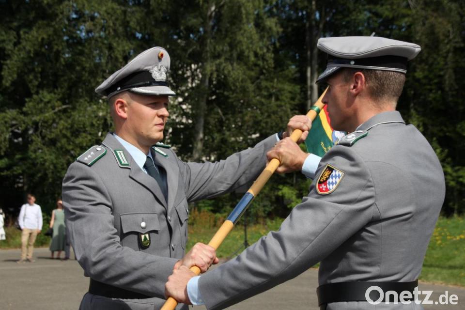 Die symbolische Übernahme des Kompaniewimpels von Hauptmann Eckert und die Übergabe an Hauptmann Volker Lisson setzte den Schlusspunkt unter die Kommandoübergabe. Ein Empfang im Freien unterhalb des Offizierheimes schloss sich an. Dort dankten Zweiter Bürgermeister Bernhard Rom für die Patengemeinde Moosbach und Dritter Bürgermeister Alfons Raab für die Patenstadt Vohenstrauß sowie Vertreter der Soldaten- und Kriegerkameradschaft Tröbes dem scheidenden Kompaniechef für die Zusammenarbeit. Das gute Miteinander boten sie auch dem neunen Kompaniechef an.