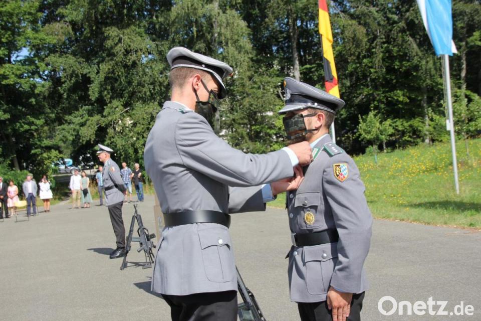Drei Jahre führte Hauptmann Marcus Eckert die dritte Kompanie des Panzergrenadierbataillons 122. Zur Übergabe hatte der Kommandeur, Oberstleutnant Andreas Bleek, in der Grenzlandkaserne einen offiziellen Akt angesetzt, der allerdings wegen der Pandemie nicht als Bataillonsappell stattfinden konnte. Der Rahmen war diesmal vergleichsweise klein: "Angetreten" waren Verwandte und Freunde des bisherigen und des neuen Kompaniechefs, Abordnungen aus den Patengemeinden Moosbach und Vohenstrauß sowie Delegationen von Traditionsvereinen.