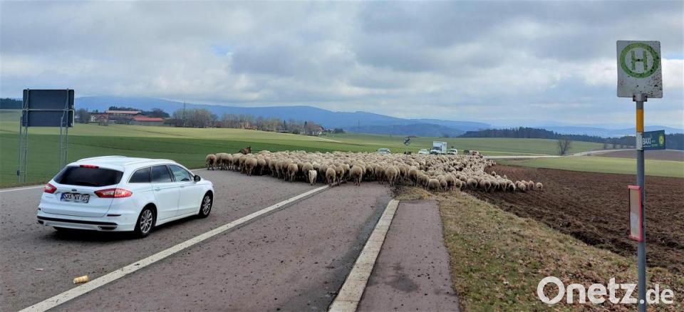 Auf ihrem Weg zu den Weiden des Truppenübungsplatzes Hohenfels kam die Herde des Wanderschäfers Paul Panko aus dem niederbayerischen Hunderdorf auch wieder nach Nunzenried. Dabei zeigte sich, wie 1100 Schafe eine vielbefahrene Straße wie die B 22 überqueren. Das Betreuungsfahrzeug des Schäfers fungiert gleichsam als Leittier, dem die Herde an der Bundesstraßen-Kreuzung Richtung Nunzenried sehr zügig folgte. Der achtjährigen Hütehündin Maya kam hierbei eine wichtige Aufgabe zu. Schon vor der Überquerung hielt sie auf einen Pfiff des Schäfers hin die Tiere zusammen, so dass die nicht ungefährliche Querungsaktion sicher vonstattenging. "Maya ist ruhiger und entspannter als ihre Kollegen", begründet der Schäfer ihre Auswahl für das Passieren der Bundesstraße. Es fiel auf, dass seit kurzem auch zwei Esel zur Herde gehören.