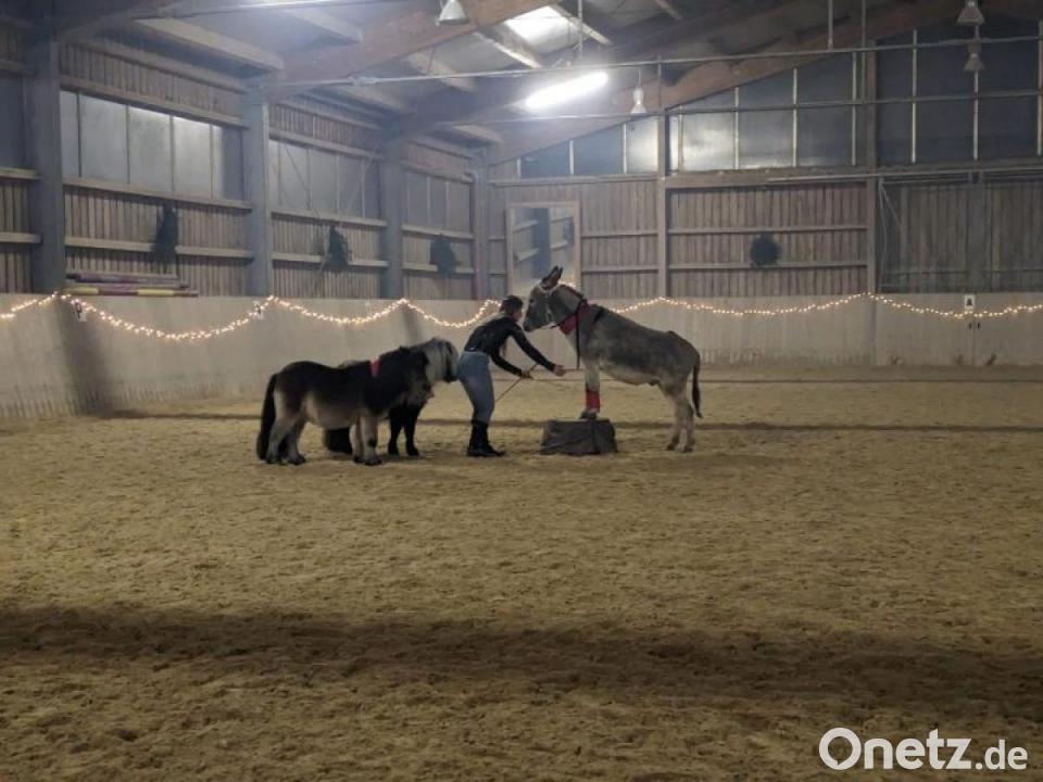 Welche Energie Pferde haben, und wie sie die Zuneigung zu ihrer Besitzerin zeigen, demonstrierte die neue Reitlehrerin Bianca Kuhbandner mit ihrem eigenen Pferd. Auf ihre Anweisung hin ging der Haflinger rückwärts, trippelte und hob die Vorderbeine abwechselnd hoch, was natürlich mit einem Leckerli belohnt wurde. Ein Pas-de-Deux zur Melodie des Filmklassikers "Drei Haselnüsse für Aschenbrödel" mit Pferden, die mit Lichterketten geschmückt waren, verbreitete weihnachtliche Stimmung.