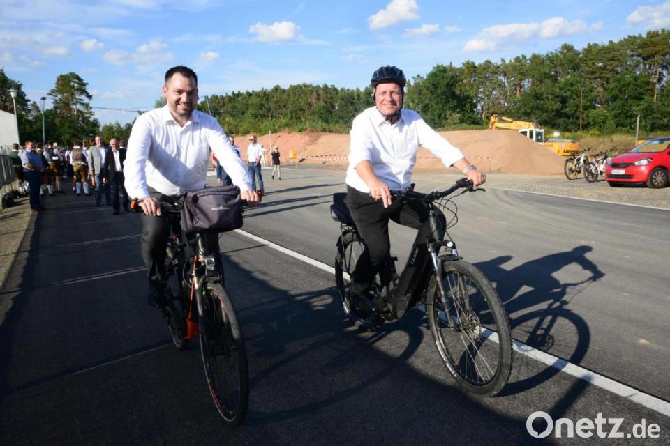 Unter den Klängen der Blaskapelle Oberwildenau schwangen sich Staatsminister Bernreiter und Bürgermeister Hartl aufs Rad und begutachteten den Radweg vom SC-Gelände bis zur A 93 und zurück.