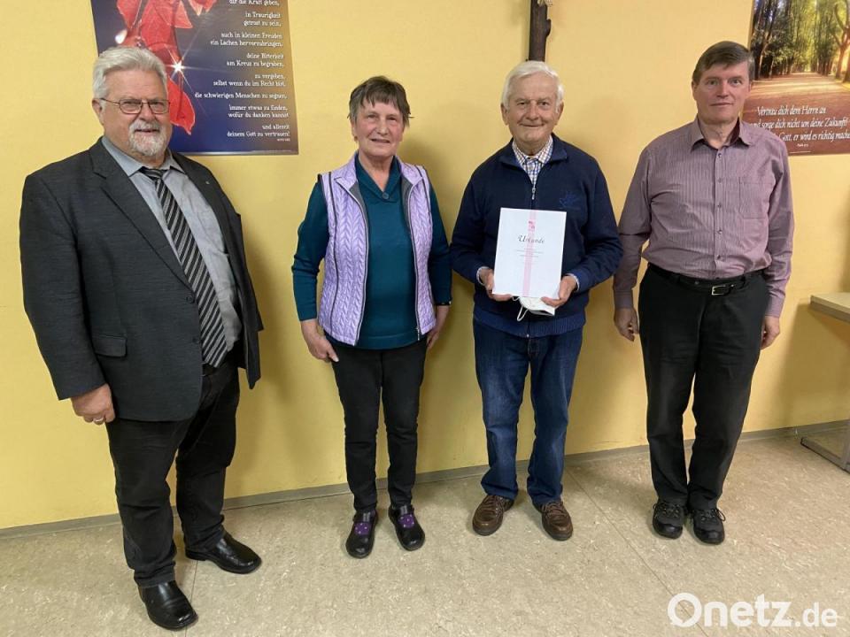 Pfarrer Arnold Pirner und Kreisvorsitzender Georg Schreglmann ehrten Johann Kiener für 40 Jahre Mitgliedschaft. Er erhielt die Ehrenurkunde mit Goldnadel. Pfarrer Pirner dankte vor allem auch Helga Goschler für ihre 13-jährige Tätigkeit als KAB-Vorsitzende und für 15 Jahre als Betreuerin und überreichte Blumen.