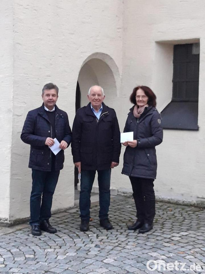 Hermann Frischholz (Mitte) überreicht an Bernhard Meiler (links), Pilgerführer der Altöttingwallfahrt, und an die Verantwortliche der Maria-Kulm-Wallfahrt, Christine Schwab (Rechts) eine Spende, die er sich von seinen Geburtstagsgästen anstatt von Geschenken erbeten hatte. Frischholz stockt den Betrag auf, damit ein runder Betrag zustande kommt.