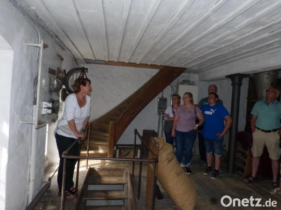 Aber die Hauptsache waren die Führungen durch die gut erhaltene Kunstmühle. Im Untergeschoss mit den vielen Schwungrädern der Transmission zum Antrieb der technischen Ausstattung erzählten Gabriele Leonie und Fabian Bräutigam als Eigentümer des Anwesens von der Geschichte, die 1368 begann. 1820 entstand das Gebäude in seiner heutigen Gestalt.