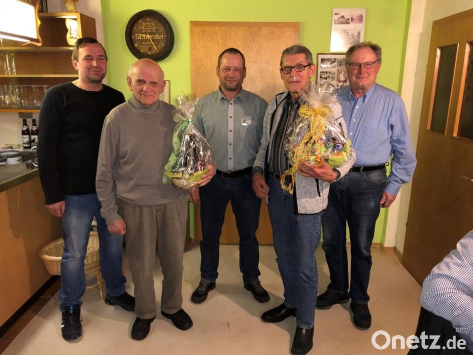 Jagdvorsteher Karl Eckl (Mitte) gratuliert im Anschluss den langjährigen Mitpächtern Karl Eckl und Ludwig Pregler (von links) nachträglich zu ihrem 80. Geburtstag. Er dankt ihnen für die langjährige gute Zusammenarbeit und überreicht ihnen im Namen der Jagdgenossenschaft ein Geschenk. Dazu gratulieren auch Kassier Jakob Sauer (links) und Schriftführer Eduard Fuchs (rechts).