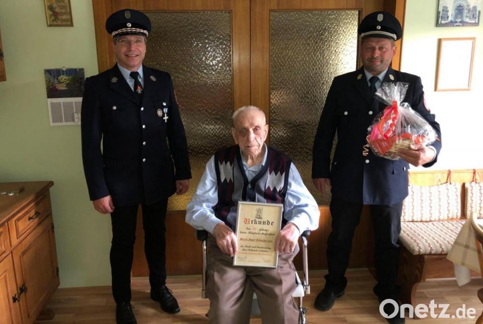 70 Jahre Mitglied bei ein und derselben Feuerwehr zu sein, ist schon etwas Besonderes. Josef Irlbacher senior aus Ödpielmannsberg trat im März 1951 in die Feuerwehr seines Heimatortes ein und ist heute noch ein treues Mitglied. Da mussten natürlich der Vorsitzende Hermann Ach und Kommandant Karl Eckl ausrücken, um den Jubilar zu ehren. Die beiden Führungskräfte der Wehr dankten Irlbacher für seine treuen Dienste. Besonders erinnerten Sie daran, dass er im Jahre 1951 zu den Gründungsmitgliedern der Feuerwehr Ödpielmannsberg gehörte, unter dem Motto „Gott zur Ehr, dem Nächsten zur Wehr“. Wenn die Wehr rief, war Irlbacher zur Stelle und das 70 Jahre lang. Er sei ein Vorbild für die Jugend. Der 94-Jährige freute sich über den Besuch von Ach und Eckl: „Es ist schön, dass ich noch in meinem Alter mit euch Feuerwehrleuten ein Bier trinken kann“.