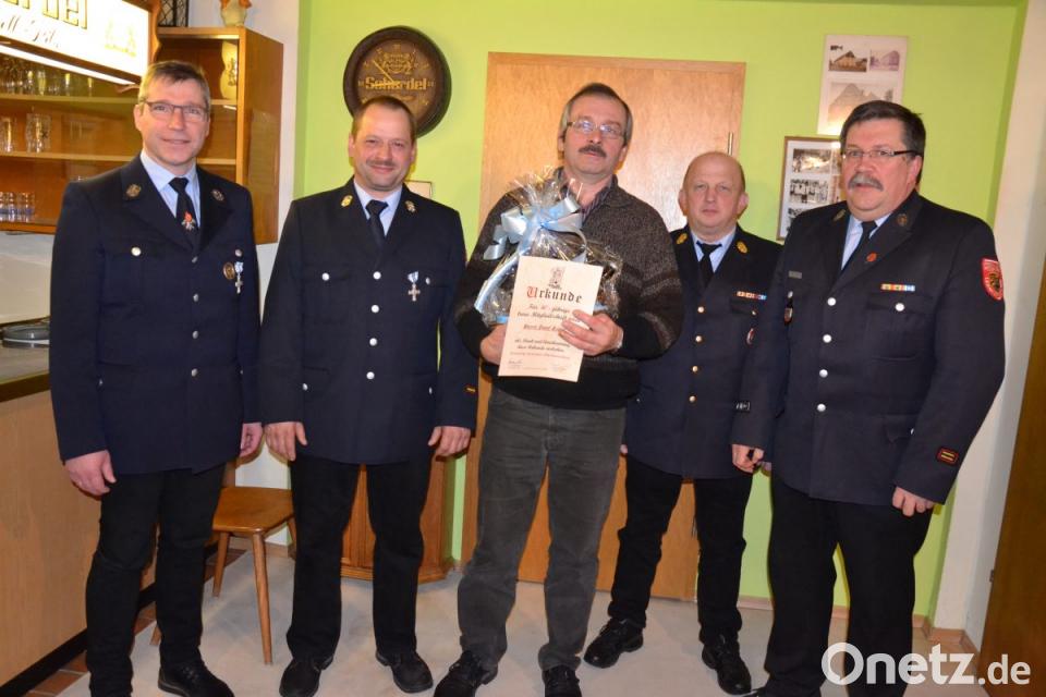 Vorsitzender Hermann Ach überreichte mit Kommandant Karl Eckl und sowie mit Kreisbrandinspektor Martin Weig und Kreisbrandmeister Thomas Kleber an die Jubilare, die alle Jahrzehnte lang aktive Feuerwehrleute waren, Urkunden und einen Geschenkkorb.