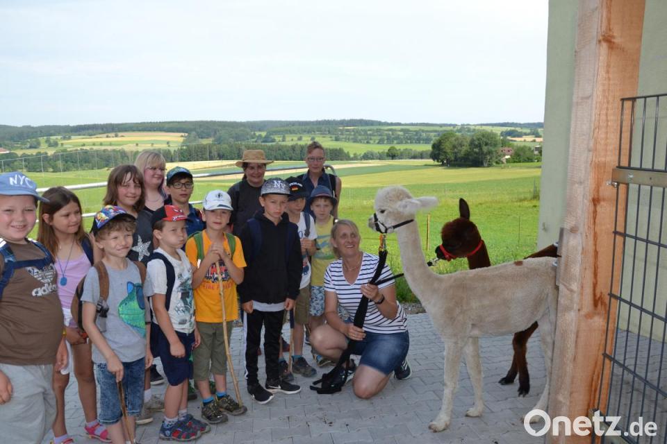 Die Ferienkids wanderten mit ihrem Betreuerteam Claudia Rappl, Jacqueline Meißner und Petra Zielbauer von der Schule in Moosbach nach Ödpielmannsberg. Der Weg führte abseits der Straße über Leinschlag auf einem Wanderweg nach Ödpielmannsberg. Dazwischen wurde natürlich bei den hochsommerlichen Temperaturen Pause gemacht und sich gestärkt. Hoch übern Dorf kamen sie in den Ort. Ziel waren die Alpakas von Sebastian Ach und seiner Mutter Wilma.