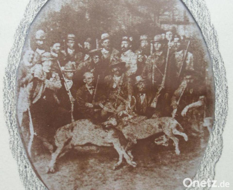 Ein martialisch wirkendes Bild aus dem Jahr 1882 zeigt, dass der Wolf zwar schmächtiger, aber nur unwesentlich kleiner als der daneben liegende Achtenderhirsch war und fast die Körperlänge und Schulterhöhe des Hirsches erreicht hatte. Ein weißes Kreuz bezeichnet den Schützen Martin Wiesend. Der uniformierte Waidmann links neben dem Schützen könnte der damals 30 Jahre alte Förster Hugo Mechler, der Hirschschütze sein. Er brachte die Jagdeindrücke 50 Jahre später zu Papier. Das ovale Foto trägt die Inschrift: "Gesch. 21. Juli 1882 (Geschossen am 21. Juli 1882) Der Balg blieb als Jagdtrophäe."