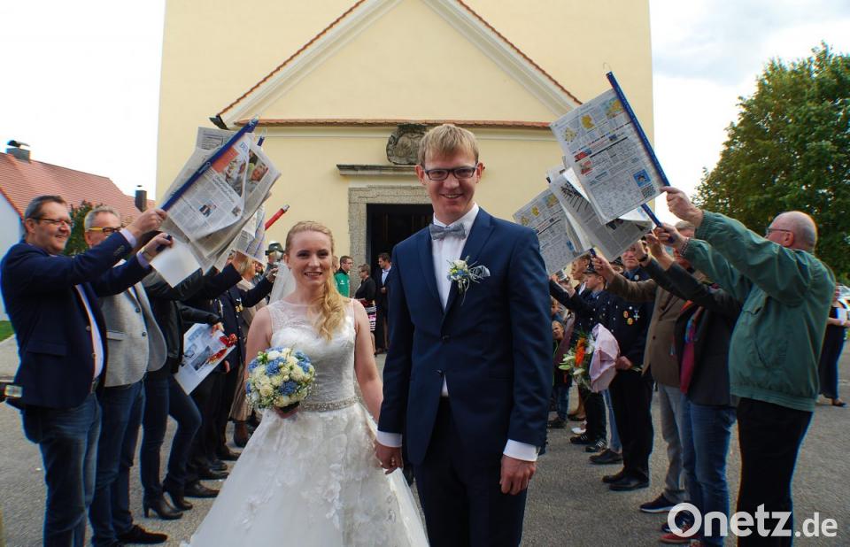 Vor dem Hauptportal der Kirche postiert hatten sich Mitglieder der Vereine, in denen das Paar Mitglied ist: Aktiv dabei ist Martin Maier bei der Feuerwehr und beim TSV. Franziska Bötzl ist bei den Ottengrüner Böllerschützen aktiv, die ebenfalls gratulierten. Die aus Waldsassen stammende Braut ist bekannt als Mitglied beim Akkordeon-Ensemble der Kreismusikschule unter Leitung von Alois Fischer. Martin Maier ist Redakteur bei Oberpfalz-Medien: Mitglieder der Stiftland-Redaktion flankierten mit Zeitungen das Paar auf dem Weg in den neuen Lebensabschnitt und wünschten dafür viel Glück. Ressortleiter Wolfgang Benkhardt überreichte zur Erinnerung an den besonderen Tag eine gerahmte Sonderausgabe der Zeitung „Der neue Tag“ – mit der Hochzeit als Schlagzeile. Getraut wurde das Paar von Markus Meier. Der Seelsorger, der als Pfarrvikar in Viechtach tätig ist, kennt die Braut von seiner Zeit in der Pfarrgemeinde Waldsassen: Franziska Bötzl gehörte viele Jahre zur Ministranten-Schar in der Basilika.