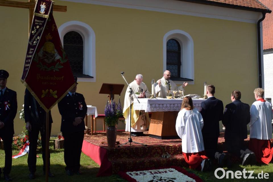 Die Bewohner von Pamsendorf hatten den Freialtar am Kirchenvorplatz wunderbar hergerichtet. Sogar das Gotteshaus hat einen neuen Anstrich erhalten. Alles war für den großen Augenblick bestens vorbereitet.