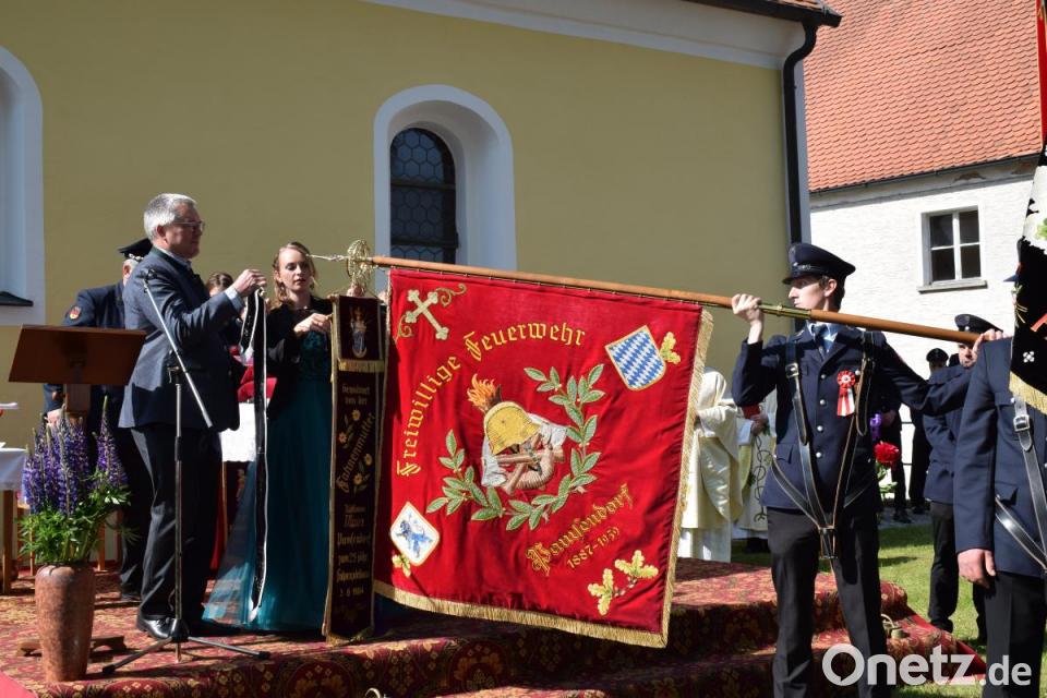 Am Ende des Gottesdienstes segnete Spitzhirn die Fahnenbänder, die an das Jubelfest erinnern sollen. Die Festdamen der Jubelwehr aus Pamsendorf und die Festdamen des Patenvereins aus Hohentreswitz hefteten die Bänder an die Fahnen. Schirmherr Bürgermeister Richard Tischler befestigte das Band der Stadt Pfreimd an der neu renovierte Fahne der Feuerwehr Pamsendorf. Zum Abschluss des Festgottesdienstes dankte der Pfarrer den Feuerwehrleuten, die sich auch das Jahr über in den Dienst der Kirche stellen. Mit dem Lied "Großer Gott wir loben Dich", intoniert von der Stadtkapelle und begleitet vom Gesang der vielen Gottesdienstbesucher, fand der kirchliche Teil einen Abschluss.