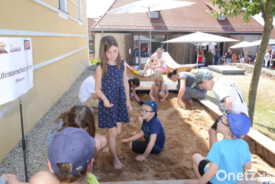 Im Freigelände konnten sich die Mädchen und Buben in einem Sandkasten auf Schatzsuche begeben. Ob da ein echter Diamant gefunden wurde, bleibt das Geheimnis von Museumsleiterin Regina Kiermaier. Unterm nächsten Sonnensegel durften die Kinder Steine bemalen oder sich selbst schminken lassen.