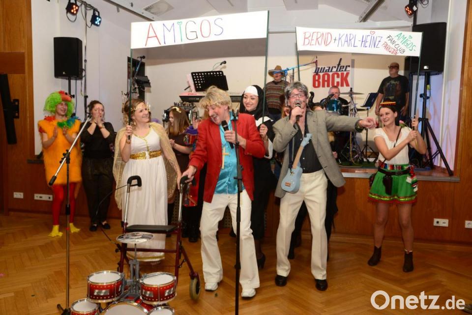 Mit Rollator und Gehstock kamen sie auf die Bühne und legten wie die Originale sofort los. Heinz Rast und Hans Hausner waren die „Amigos“. Die Musik wurde immer wieder vom Lachen der Besucher übertönt. Dann sprachen die „Amigos“ zum Publikum: Sie hätten gemeint, heute vor älteren Damen spielen zu müssen. Dass so viele junge Leute hier seien, verwundere. „Wir sind jung geblieben“, meinten die beiden, auch wenn der optische Eindruck mehr ins Gegenteil ging.