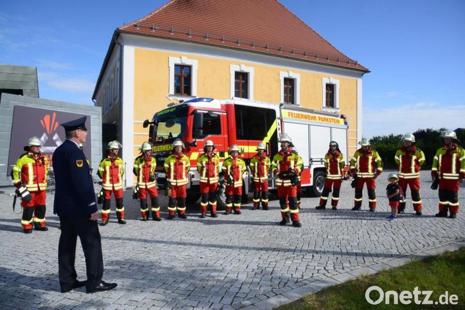 Bäumler bezeichnete das HLF 20 als einen „Alleskönner“ für „jeden erdenklichen“ Einsatz. Damit schließt der Kommandant Brandeinsätze und Technische Hilfeleistung in einem Atemzug ein. Mit der Ausrüstung des Fahrzeuges für zwei Löschgruppen mit 18 Feuerwehrmännern oder –Frauen kann ein Wohnungsbrand bekämpft werden. Im HLF 20 verstaut sind für Technische Hilfeleistungen der übliche hydraulische Rettungssatz mit Schere, Spreitzer und Rettungszylinder, Hebekissen, Rettungsplattform, Rettungssäge und Vieles mehr. Damit ist die Parksteiner Wehr auch für den Einsatz auf der Straße bestens vorbereitet. Stefan Bäumler dankte allen beteiligten Marktgemeinderatsmitgliedern, auch in der zurückliegenden Wahlperiode, für den Kauf des Fahrzeuges, das für eine bestmögliche Sicherheit der Bürger sorge. Dann überreichte der Kommandant den großen Autoschlüssel an Bürgermeister Sollfrank, der ihn dann wieder symbolisch an Bäumler zurückgab.