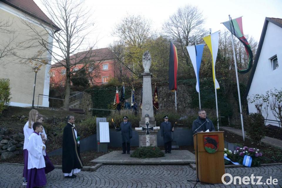 Bürgermeister Reinhold Sollfrank stellte in seiner Ansprache zum Volkstrauertag den Wandel der Zeit heraus: Vor einigen Jahren sei es unvorstellbar gewesen, Sorge um den bestehenden Frieden in Europa haben zu müssen. Doch jetzt sei nur 1.000 Kilometer entfernt in der Ukraine der Krieg bittere Wahrheit. "Der Gedanke vom großen, friedlichen Miteinander in Europa kommt ins Wanken", betonte das Parksteiner Marktoberhaupt. Auch die Wahlergebnisse in Deutschland und in den Nachbarländern ließen erkennen, dass Gegner des europäischen Gedankens auf dem Vormarsch seien. Nicht selten würden rechte Gesinnungen offen ausgesprochen und sogar bejubelt. Die Frage nach dem schnellen Vergessen von Krieg und Leid verband Sollfrank mit der Frage, ob es der Friede und die Freiheit nicht wert sei, sich dafür einzusetzen. Nach der Ansprache legte der Bürgermeister am Kriegerdenkmal einen Kranz nieder. Erwin Schraml, Vorsitzender des Krieger- und Soldatenvereins Parkstein gedacht den Toten der beiden Weltkriege und legten auch einen Kranz nieder.