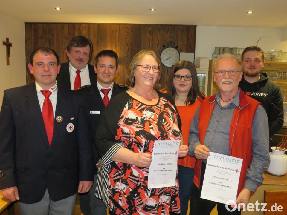 Stellvertretender Kreisbereitschaftsleiter Thomas Rauch lobte die Leistungen die von den Helfern vor Ort geleistet werden. Er dankte den Aktiven und der Leitung, die viel für das Wohl der Menschen tun. Im Namen des BRK überreichte er an Rudi Eckl und Regina Pausch Urkunde für 5 Jahr aktiven Dienst.