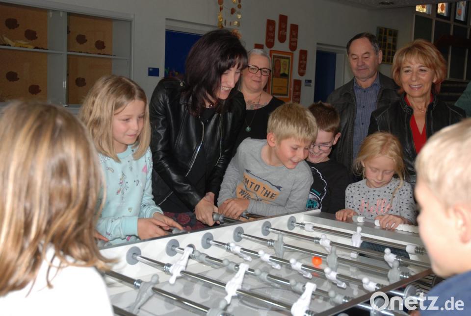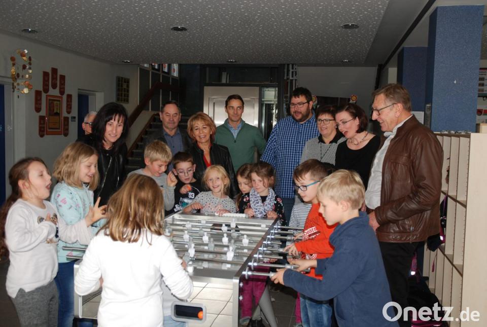 Seit September kümmert sich die Gemeinde um die Mittagsbetreuung der Schulkinder und die Einrichtung ist im Schulgebäude. Die Betreuung selbst übernimmt die „Gfi Weiden“. Da für die Zeit nach dem Mittagessen Spielmaterial gut gebraucht werden kann, hatten die Vorstände von CSU, Junger Union und Frauen-Union die Idee, einen Kicker zu spendieren.