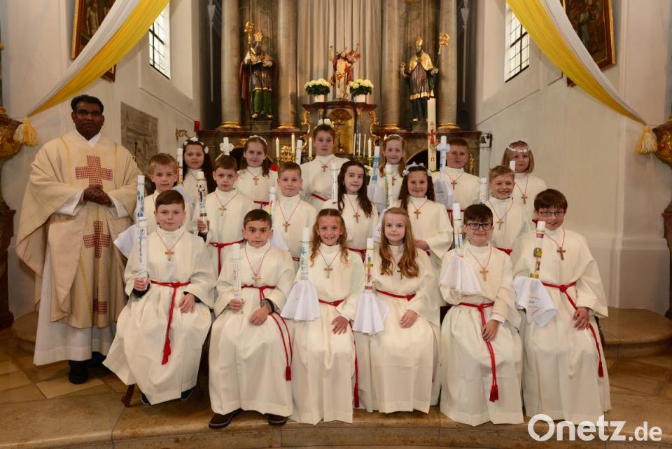 „Geborgen in Gottes Hand“, überschrieb Pfarrer Pennoraj Thamarkkan den Festgottesdienst in der St. Pankratius-Kirche. Dazu bat der Geistliche die Erstkommunion-Kinder, ihre Hände genau zu betrachten, mit der Erkenntnis, dass jede Hand einmalig ist. Um aber Kontakt zu spüren, durfte der jeweilige Partner dem anderen über die Hände streichen. Damit entstehe eine Verbindung zu einem anderen Menschen – genaugenommen ein üblicher Vorgang im täglichen Leben, so der Pfarrer. Die Hände bewusst zu gebrauchen, die Mittel um Halt zu bekommen, die einem Menschen auch Lasten abnehmen, die sich auch falten um zu beten – Pfarrer Pennoraj Thamarkkan stellte damit die Verbindung zu Gott her, der die Menschen auch in seinen Händen hält, als Zeichen der Geborgenheit. Zum Abschluss dankte der Geistliche dem Jugendchor unter Leitung von Rita Trescher für die gelungene Umrahmung des Festgottesdienstes.