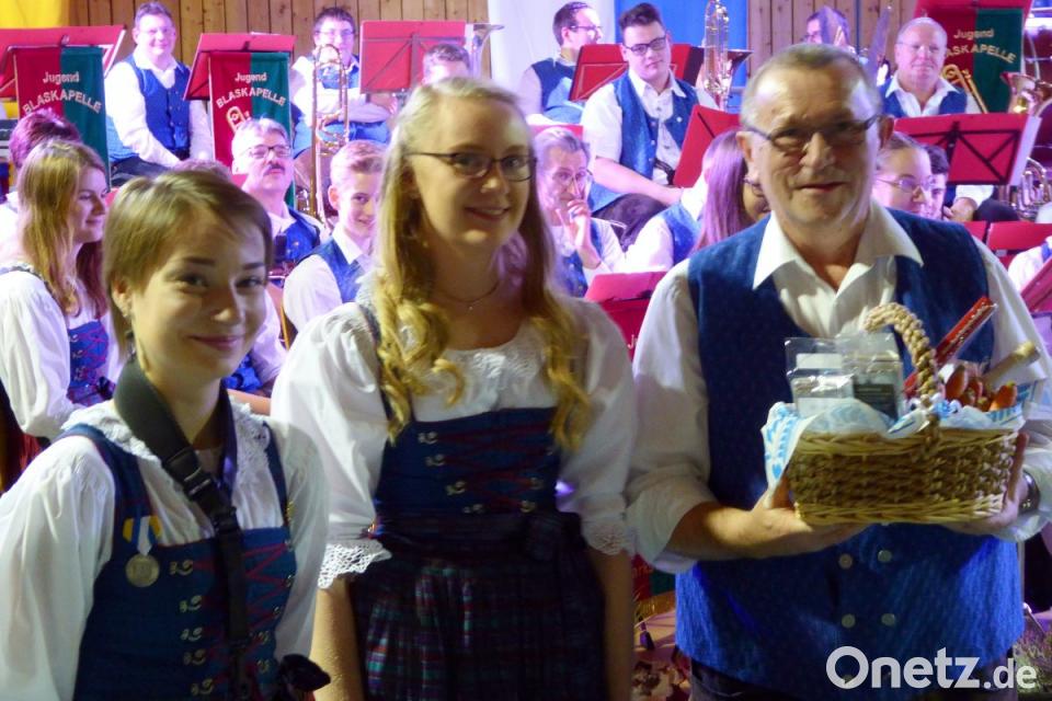 Bei der Polka „Böhmische Liebe“ des Zillertalers Mathias Rauch kam erstmals der weiche Gesang von Rudolf Trescher und Dieter Hundhammer zum Einsatz. Bevor die Hörner Raum zur Entfaltung im „Montana Marsch“ hatten, der dem Namen nach an „Bergstoi“ anknüpft, überreichten die zwei Jungsprecherinnen der Blaskapelle ihrem Dirigenten zum Dank ein originelles „Survival-Kit“. Es enthielt Karotten, damit er weiterhin gut sieht, Honig für seine bei den Proben strapazierte Stimme, Schokopralinen zur Ausschüttung von Glückshormonen, Likör für das Geistige und ein bayerisch-englisches Wörterbüchlein aufgrund seines bekannten Ausspruchs beim Einüben der Stücke: „Play dees, wos daoustäiht“.