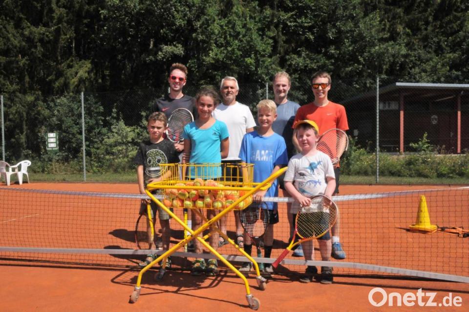 Angesichts der heißen Temperaturen waren nur vier Kinder aufs Tennisgelände gekommen. Damit genoss jedes Kind fast seine „eigene Trainerstunde“. Dominik Kaiser, Vorsitzender Hans Gschrey, zweiter Vorsitzender Michael Uschold und Lukas Amberger (von links) machten mit den Kindern lockere nicht anstrengende Ballwechsel.
