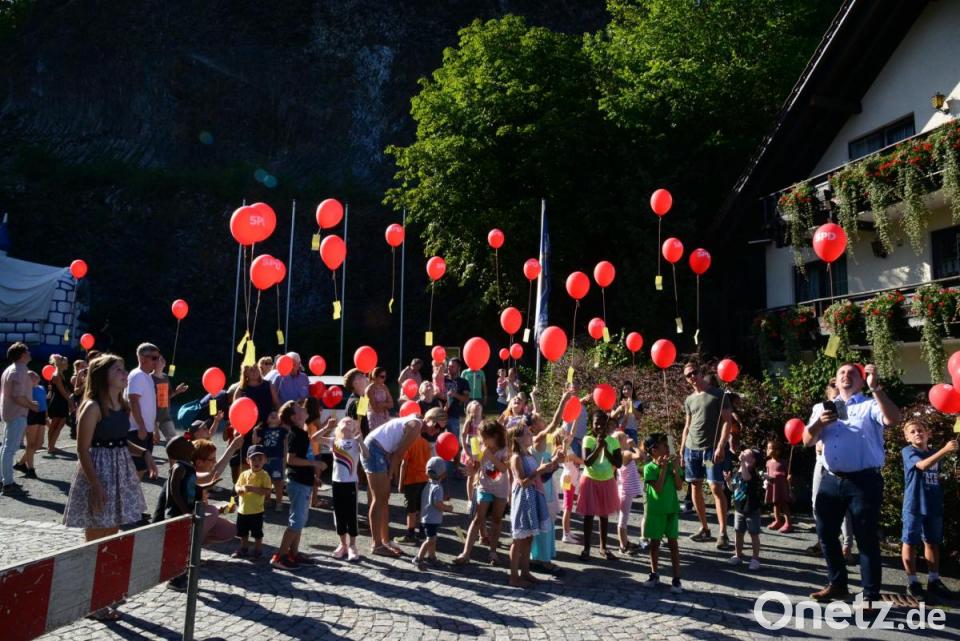 Mit Spannung erwarteten wieder die Kindern und ihre Eltern den Start des Luftballonwettbewerbs. SPD-Kreisvorsitzender und Schirmherr Markus Ludwig, dank des Sonnenscheins auch als „Sonnenschirmherr“ begrüßt, gab gegen 17.15 Uhr vor dem „Bergstüberl“ das Startzeichen für die Ballons, die traubenartig in den blauen Himmel aufstiegen und jetzt an der Landestelle auf Finder warten, die den anhängende Adresszettel an den SPD-Ortsverein zurückschicken.