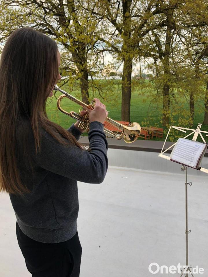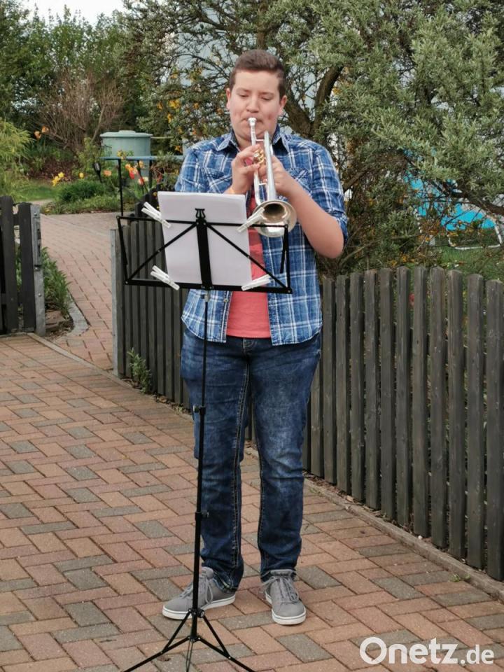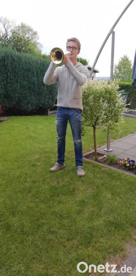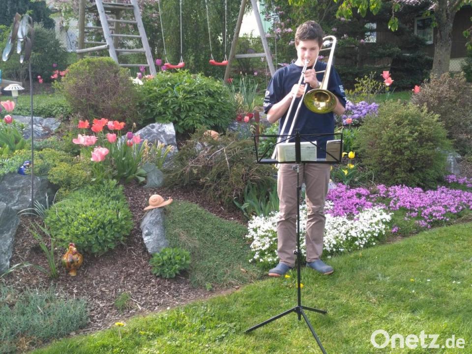 Seit sieben Wochen erfreuen die Musiker der Jugendblaskapelle Parkstein um Kapellmeister Alfons Steiner die Menschen am Sonntag um 18 Uhr mit ihrer Musik. Im Bild: Pascal Zankl (Parkstein, Amselweg)