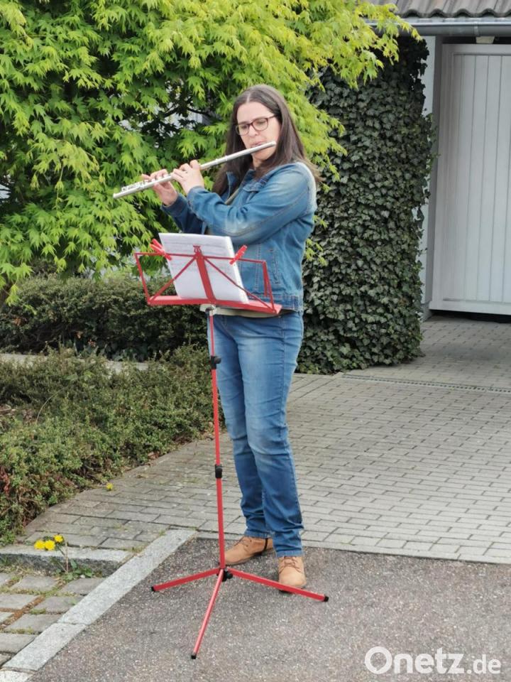 Seit sieben Wochen erfreuen die Musiker der Jugendblaskapelle Parkstein um Kapellmeister Alfons Steiner die Menschen am Sonntag um 18 Uhr mit ihrer Musik. Im Bild: Monika Wiesmann (Parkstein,Amselweg)