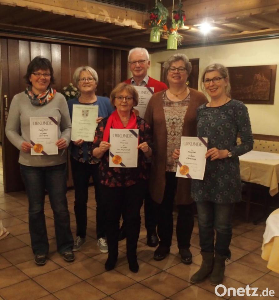 Vorsitzende Brigitte Schultz zeichnete langjährige Mitglieder aus: Josef Wittmann gehört dem Männerchor seit 40 Jahren an, Gerhard Moller seit 25 Jahren, Herta Lang und Heike Stich seit 10 Jahren. Elvira Kuhl führt seit zehn Jahren den Dirigentenstab.