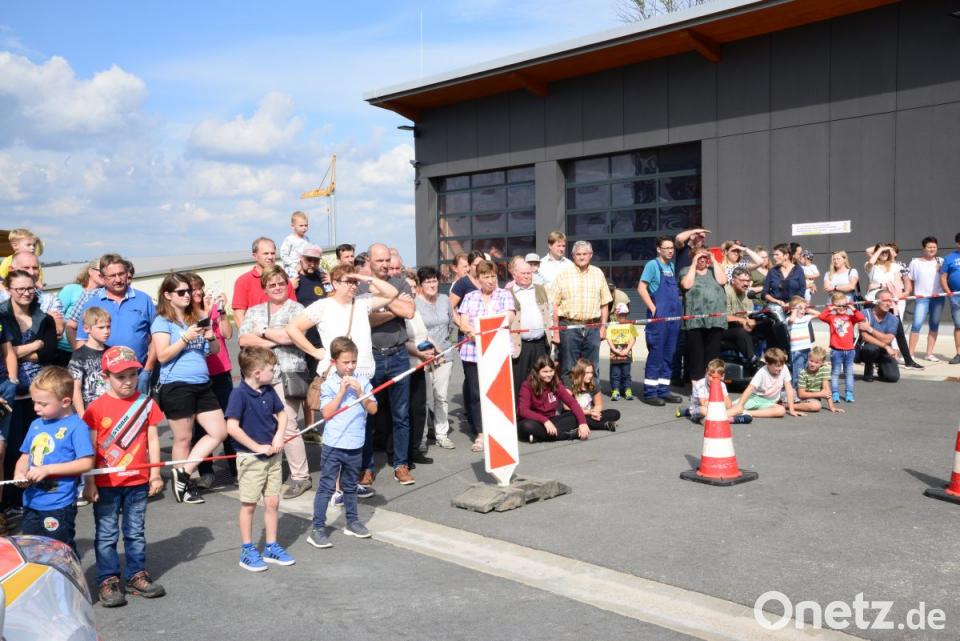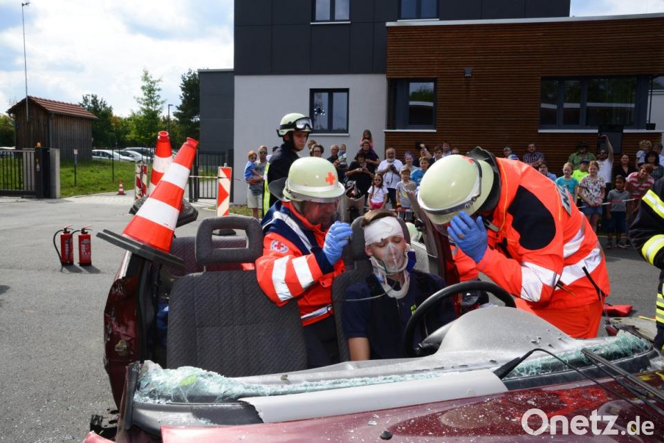 Die Fahrzeuge parkten vor dem Feuerwehrhaus. Somit konnten sich die Besucher bereits auf dem Weg vom Parkplatz zum Festgelände im Bauhof einen kurzen Einblick über die Leistungsfähigkeit der Wehr verschaffen. Das große Staunen der Besucher kam bei der Einsatzübung. Im Hofgrundstück war ein verunfalltes Auto aufgestellt, in dem sich zwei Verletzte befanden. Mit Blaulicht und Martinshorn kamen die Fahrzeuge der Wehr, die Helfer vor Ort, der Notarzt und ein Krankentransportwagen der BRK-Bereitschaft Neustadt. Kommandant Tobias Plößner informierte die Besucher über Lautsprecher über die Aufgaben der Einsatzkräfte.