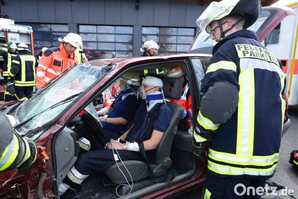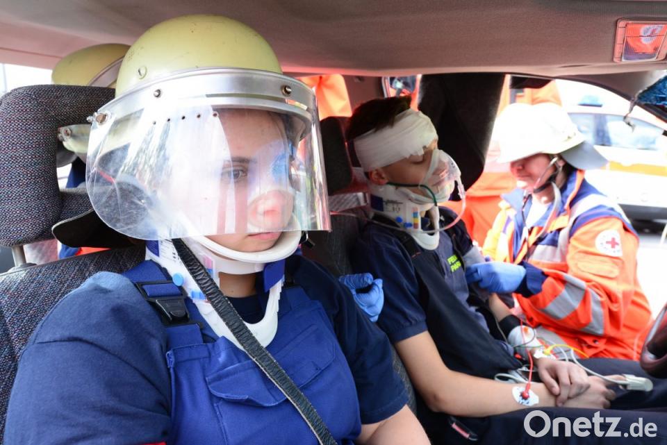 Die Wehrmänner gingen zielgerichtet bei ihrer Arbeit vor, bereiteten das notwendige Arbeitsgerät vor dem Einsatzfahrzeug aus und kümmerten sich vor allem zunächst um die verletzten Personen. Notarzt Dr. Dominik Kuhbandner und die Helfer vor Ort versorgten den Mann und die Frau, legten ihnen Verbände an, und stabilisierten den Kreislauf mit Infusionen. Mit Decken und sogar einem Feuerwehrhelm wurden die Verletzten gegen Verletzungen bei den vorbereitenden Rettungsmaßnahmen geschützt.